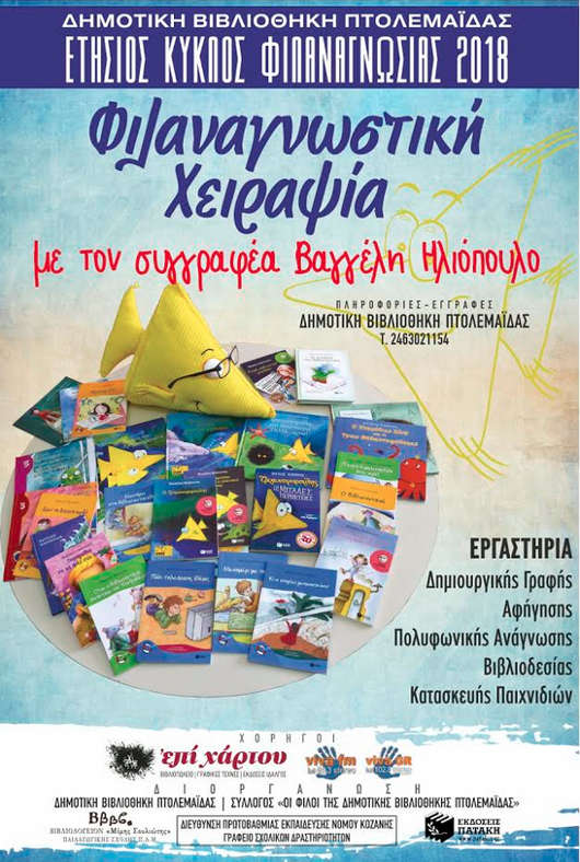 Η «Δημοτική Βιβλιοθήκη Πτολεμαΐδας», ο Σύλλογος «Φίλοι της Δημοτικής Βιβλιοθήκης Πτολεμαΐδας», το «Βιβλιολογείον, Μίμης Σουλιώτης» της Παιδαγωγικής Σχολής του Πανεπιστημίου Δυτικής Μακεδονίας, το «Γραφείο Σχολικών Δραστηριοτήτων της Διεύθυνσης Πρωτοβάθμιας Εκπαίδευσης Νομού Κοζάνης» και οι εκδόσεις «Πατάκη» συνδιοργανώνουν Ετήσιο Κύκλο Προώθησης της Ανάγνωσης με καλεσμένο συγγραφέα τον Βαγγέλη Ηλιόπουλο.