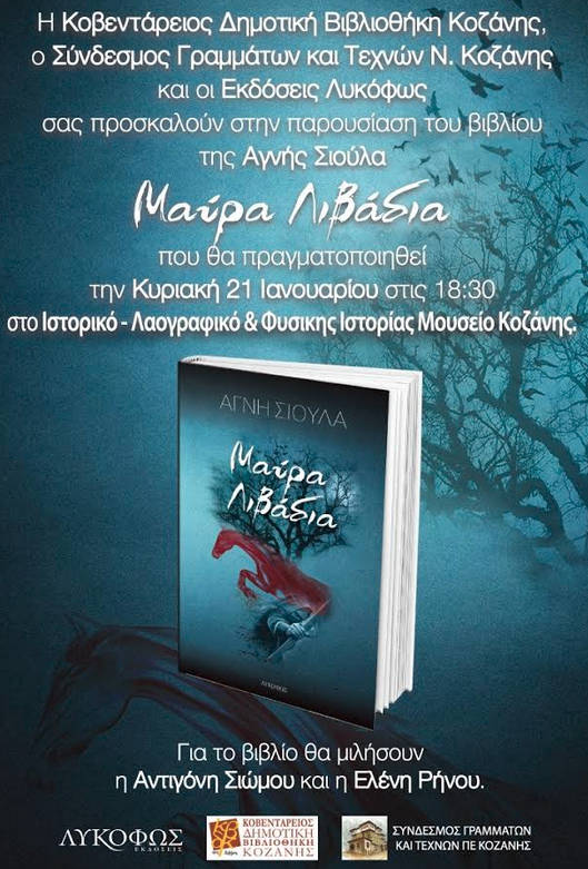 Η Κοβεντάρειος Δημοτική βιβλιοθήκη Κοζάνης, ο Σύνδεσμος Γραμμάτων και Τεχνών Ν. Κοζάνης και οι εκδόσεις Λυκόφως σάς προσκαλούν στην παρουσίαση του βιβλίου της Αγνής Σιούλα “Μαύρα Λιβάδια”, την Κυριακή 21 Ιανουαρίου 2018 στις 18:30 στο Ιστορικό – Λαογραφικό και Φυσικής Ιστορίας Μουσείο Κοζάνης.