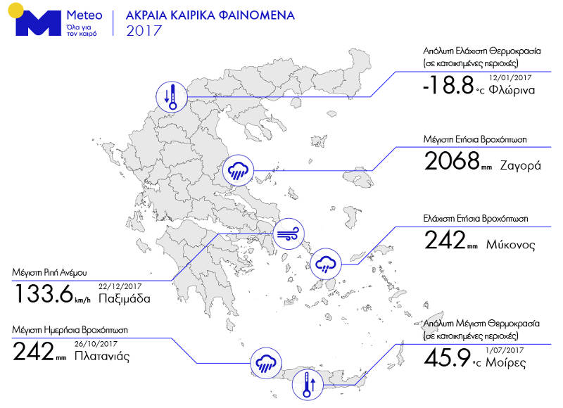 Στο χάρτη που ακολουθεί παρουσιάζονται τα ρεκόρ θερμοκρασίας, βροχόπτωσης και ταχύτητας ανέμου κατά τη διάρκεια του 2017, σύμφωνα με τις καταγραφές του δικτύου αυτόματων μετεωρολογικών σταθμών του Εθνικού Αστεροσκοπείου Αθηνών.