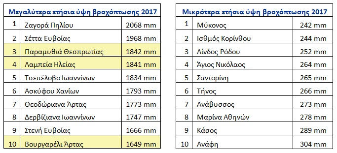 Τέλος, στους παρακάτω πίνακες παρουσιάζονται τα 10 μεγαλύτερα και τα 10 μικρότερα ετήσια ύψη βροχόπτωσης για το 2017. Με κίτρινο επισημαίνονται σταθμοί στους οποίους έχει διαπιστωθεί μερική έλλειψη δεδομένων και ως εκ τούτου οι καταγραφές υστερούν ελαφρώς των πραγματικών.