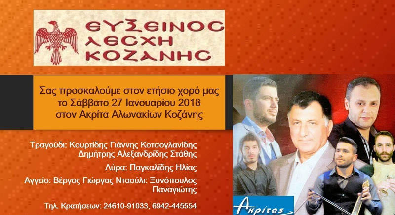 Κοζάνη 24/01/2018 Ο ετήσιος χορός της Ευξείνου Λέσχης Κοζάνης στις 27 Ιανουαρίου 2018 0 Ο ετήσιος χορός της Ευξείνου Λέσχης Κοζάνης στις27 Ιανουαρίου 2018.