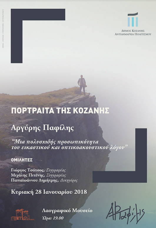 Ο Δήμος Κοζάνης και η Αντιδημαρχία Πολιτισμού, στο πλαίσιο του κύκλου εκδηλώσεων «Πορτραίτα της Κοζάνης», πραγματοποιούν αφιέρωμα με τίτλο: «Αργύρης Παφίλης: Μια πολυσχιδής προσωπικότητα του εικαστικού και οπτικοακουστικού λόγου». Ομιλητές: Γιώργος Τσότσος Συγγραφέας, Μιχάλης Πιτένης Συγγραφέας, Παπαϊωάννου Δημήτρης Δικηγόρος.
