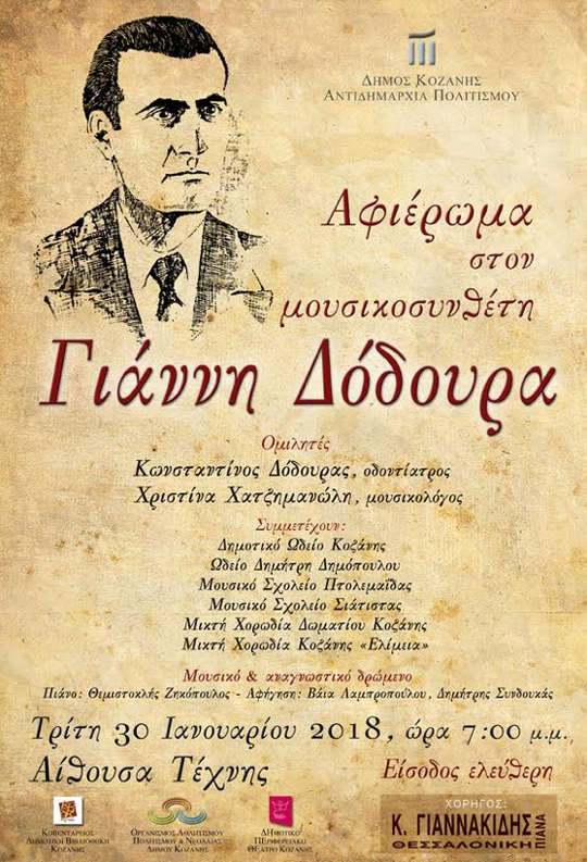 999ikytdeo7ktsdykduΗ Κοβεντάρειος Δημοτική Βιβλιοθήκη, ο Οργανισμός Αθλητισμού, Πολιτισμού και Νεολαίας και το ΔΗΠΕΘΕ Κοζάνης, στο πλαίσιο του πολιτιστικού προγράμματος της Αντιδημαρχίας Πολιτισμού για το διάστημα Ιανουαρίου – Απριλίου 2018, πραγματοποιούν αφιέρωμα στον Μουσικοσυνθέτη Γιάννη Δόδουρα (1917 – 1947), με αφορμή την συμπλήρωση Εκατό Χρόνων από την Γέννηση του. Η εκδήλωση θα λάβει χώρα στην Αίθουσα Τέχνης, την Τρίτη 30 Ιανουαρίου 2018, ώρα 7 μ.μ., και περιλαμβάνει: