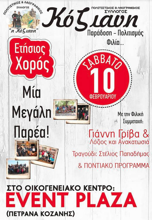 Το Σάββατο της Μικρής Αποκριάς 10 Φεβρουαρίου 2018, στο οικογενειακό κέντρο «EVENT PLAZA» στα Πετρανά Κοζάνης, θα γίνει ο ετήσιος χορός του Πολιτιστικού & Λαογραφικού Συλλόγου Κοζάνης «Η Κόζιανη».