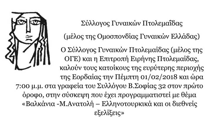 Πτολεμαΐδα 29/01/2018 Σύσκεψη του Συλλόγου Γυναικών Πτολεμαΐδας με θέμα «Βαλκάνια – Μ.Ανατολή – Ελληνοτουρκικά και οι διεθνείς εξελίξεις» 0 Σύσκεψη του Συλλόγου Γυναικών Πτολεμαΐδας με θέμα «Βαλκάνια – Μ.Ανατολή – Ελληνοτουρκικά και οι διεθνείς εξελίξεις»