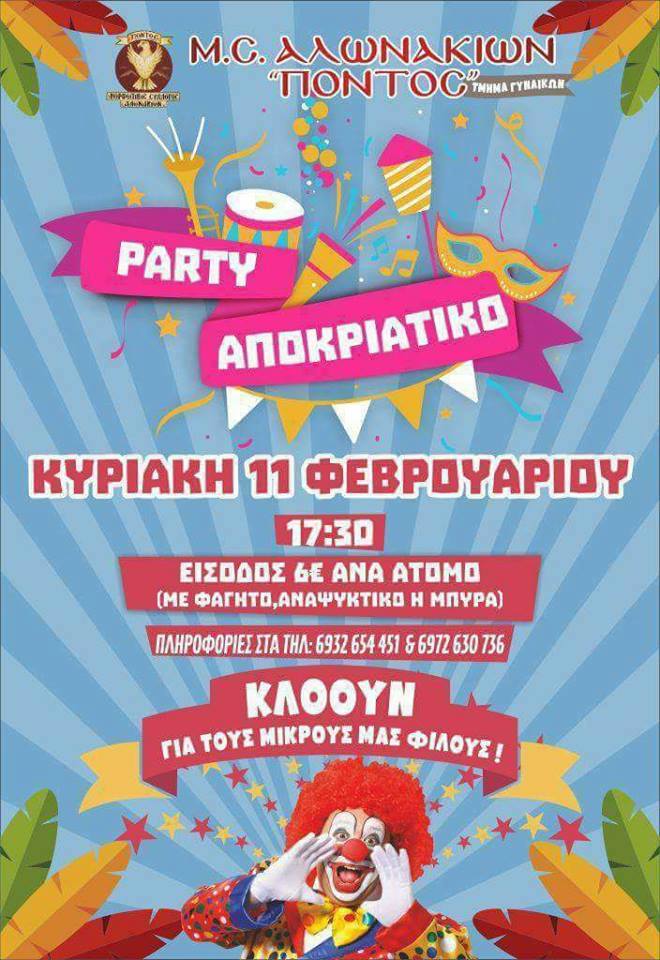 Ο Μορφωτικός Σύλλογος Αλωνακίων «Πόντος» διοργανώνει και προσκαλεί μικρούς και μεγάλους στο καθιερωμένο Αποκριάτικο Πάρτι, την Κυριακή 11 Φεβρουαρίου 2018 στις 17:30.