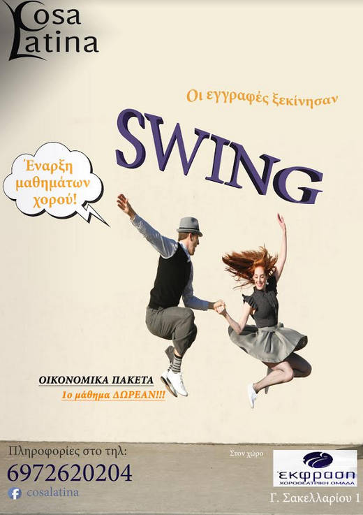 Τζαζ, ροκ, μπλουζ, ποπ, ηλέκτρο, όποια κι αν είναι τα ακούσματά σας, αυτός είναι ο χορός σας! Το σουίνγκ είναι κατάλληλο για όλες τις ηλικίες και δεν χρειάζεται συγκεκριμένη φυσική κατάσταση! Αντιθέτως, θα σας φτιάξει τη διάθεση και θα βελτιώσει τη σωματική σας υγεία! Το πρώτο μάθημα προσφέρεται εντελώς δωρεάν! Μη χάσετε επομένως την ευκαιρία και δοκιμάστε να χορέψετε σουίνγκ με τους COSA LATINA.