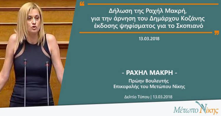 Δήλωση της Ραχήλ Μακρή, για την άρνηση του Δημάρχου Κοζάνης έκδοσης ψηφίσματος για το Σκοπιανό»