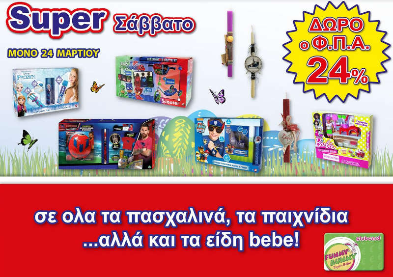 Μόνο αυτό  το Σάββατο 24 Μαρτίου τα καταστήματα Funny Bunny σας κάνουν δώρο το ΦΠΑ 24% με κάθε αγορά σε όλα τα προϊοντα! Λαμπάδες,   παιχνίδια, ποδήλατα,  είδη Bebe , παιχνίδια εξωτερικού χώρου και πολλά άλλα είδη!