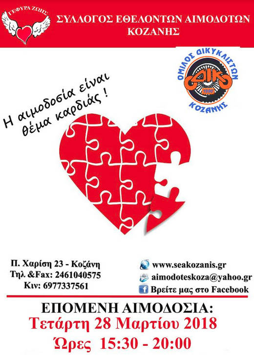 * (Ανακοινώσεις, Πρόγραμμα των επόμενων Αιμοδοσιών – Ενημέρωση για δωρεά Αιμοπεταλίων, Μυελού των Οστών, Ιστών και Οργάνων αλλά και Ομφαλοπλακουντιακού Αίματος (Βλαστοκυττάρων), στα γραφεία του συλλόγου μας Παύλου Χαρίση 23, Φαξ-τηλ.:2461040575 κινητό: 6977337561, στην ηλεκτρονική μας διεύθυνση, www.seakozanis.gr και στο facebook: Σύλλογος Εθελοντών Αιμοδοτών Κοζάνης)