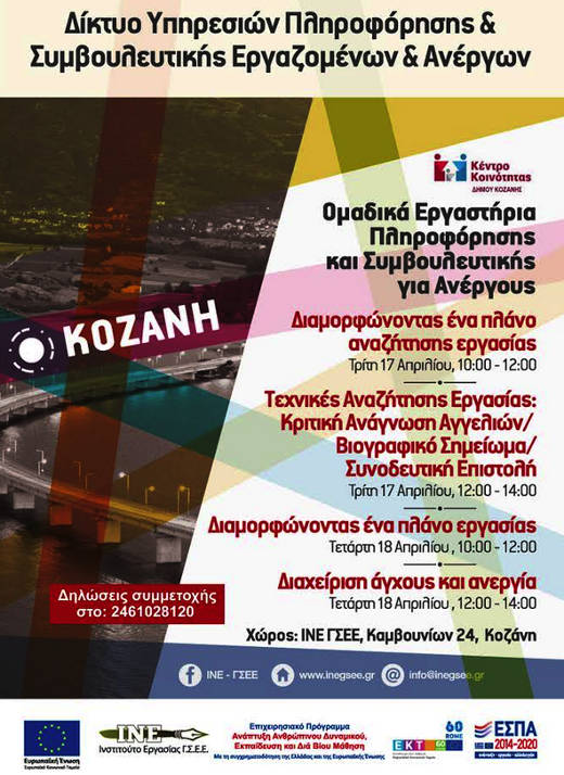 Το Κέντρο Κοινότητας Δήμου Κοζάνης σε συνεργασία με το Ινστιτούτο Εργασίας της Γ.Σ.Ε.Ε. Δυτ. Μακεδονίας, στο πλαίσιο της παροχής υπηρεσιών που προωθούν την απασχόληση και διασφαλίζουν την κοινωνική ένταξη των ωφελούμενων του Κέντρου Κοινότητας αλλά και των πολιτών του Δήμου Κοζάνης, συνδιοργανώνουν ομαδικά εργαστήρια επαγγελματικής συμβουλευτικής και συμβουλευτικής για ανέργους.