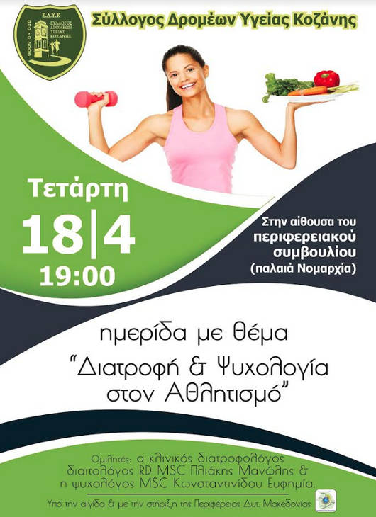 Ο Σύλλογος Δρομέων Υγείας Κοζάνης διοργανώνει την Τετάρτη 18 Απριλίου ημερίδα με θέμα «Διατροφή & Ψυχολογία στον Αθλητισμό» στις 7 μ.μ. στην αίθουσα του περιφερειακού συμβουλίου Κοζάνης (παλαιά Νομαρχία).