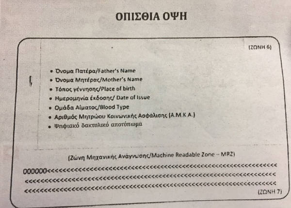 Ζώνη 6: Όνομα Πατέρα, Όνομα Μητέρας, Τόπος γέννησης, Ημερομηνία έκδοσης, Ομάδα Αίματος, Αριθμός Μητρώου Κοινωνικής Ασφάλισης (Α.Μ.Κ.Α.), ψηφιακό δακτυλικό αποτύπωμα