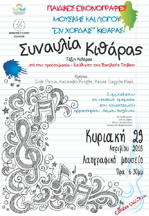 9ujydjyrtsjtrsjtrsytdyuΤο Δημοτικό Ωδείο Κοζάνης διοργανώνει την Κυριακή 29 Απριλίου Συναυλία κιθάρας της τάξης της Βασιλικής Τσιβίκη παράλληλα θα συμμετέχουν και τα παιδικά τμήματα του Εικαστικού Εργαστηρίου Κοζάνης.