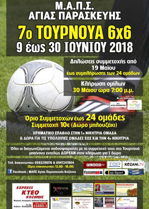 ae5rthaerhyaehtarethreΟ Μ.Α.Π.Σ. Αγίας Παρασκευής διοργανώνει το 7ο τουρνουά ποδοσφαίρου 6×6 με χρόνο διεξαγωγής από 10 Ιουνίου έως 30 Ιουνίου 2018. Ένα τουρνουά ποδοσφαίρου που έχει γίνει θεσμός, μια μεγάλη προσπάθεια που γίνεται κάθε χρόνο .
