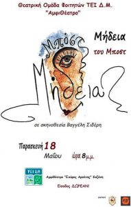 17 φοιτητές του ΤΕΙ Δ.Μ. με κινητήριο δύναμη την αγάπη τους για την υποκριτική παρουσιάζουν την «Μήδεια» του Μπόστ σε σκηνοθεσία Βαγγέλη Σιδέρη.