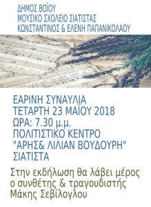 Το Μουσικό Σχολείο Σιάτιστας «ΚΩΝΣΤΑΝΤΙΝΟΣ ΚΑΙ ΕΛΕΝΗ ΠΑΠΑΝΙΚΟΛΑΟΥ» σας προσκαλεί στην Εαρινή του Συναυλία που θα πραγματοποιηθεί στο Βουδούρειο Πολιτιστικό Κέντρο Σιάτιστας την Τετάρτη 23 Μαΐου 2018 και ώρα 19.30 σε συνεργασία με το Δήμο Βοΐου.