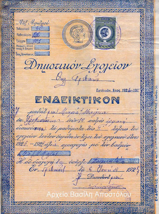 «Απόδειξις δραχμών 8.000. Ο υπογεγραμμένος Κων/νος Τσιόγκας κάτοικος του χωρίου Κουσκό (Ταξιάρχης) έλαβον παρά της εκκλησιαστικής Επιτροπής του χωρίου Εξάρχου τας άνω δραχμάς οκτώ χιλιάδας δια το σουφάτισμα του σχολείου Εξάρχου. Εν Εξάρχω τη 28 Ιουνίου 1928. Ο λαβών σουφατζής».