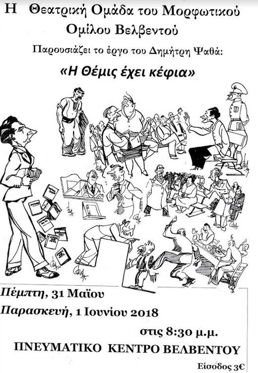 Η Θεατρική Ομάδα του Μορφωτικού Ομίλου Βελβεντού παρουσιάζει τη Θεατρική Παράσταση “Η Θέμις έχει κέφια”, την Πέμπτη 31/05 και την Παρασκευή 01/06, στις 8.30 μ.μ. στο Πνευματικό Κέντρο Βελβεντού.
