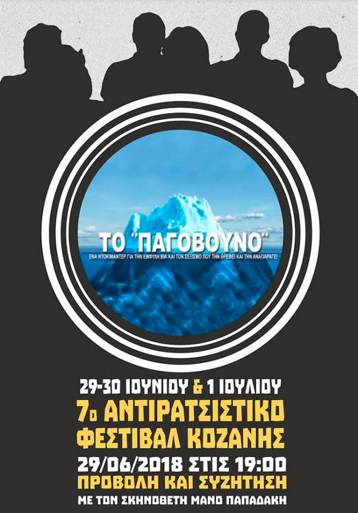 Το ντοκιμαντέρ «Το Παγόβουνο» θα προβληθεί την Παρασκευή 29 Ιουνίου, στις 19:00, στο Βαλταδώρειο Γυμνάσιο, στο πλαίσιο της θεματικής: «Προτάσεις για μια αντισεξιστική κοινωνία», του 7ου Αντιρατσιστικού Φεστιβάλ Κοζάνης. Θα ακολουθήσει συζήτηση με τον σκηνοθέτη του ντοκιμαντέρ Μάνο Παπαδάκη.