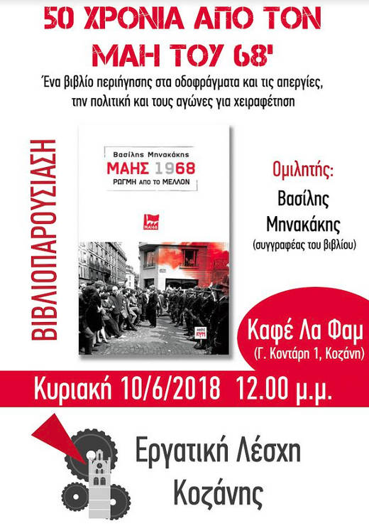 Η Εργατική Λέσχη Κοζάνης, σας προσκαλεί στην παρουσίαση του βιβλίου του Βασίλη Μηνακάκη «Μάης 1968 – Ρωγμή από το μέλλον», που θα πραγματοποιηθεί την Κυριακή 10/6/2018, 12.00 μ.μ. στο Καφέ ΛαΦαμ (Γ. Κοντάρη 1, Κοζάνη)
