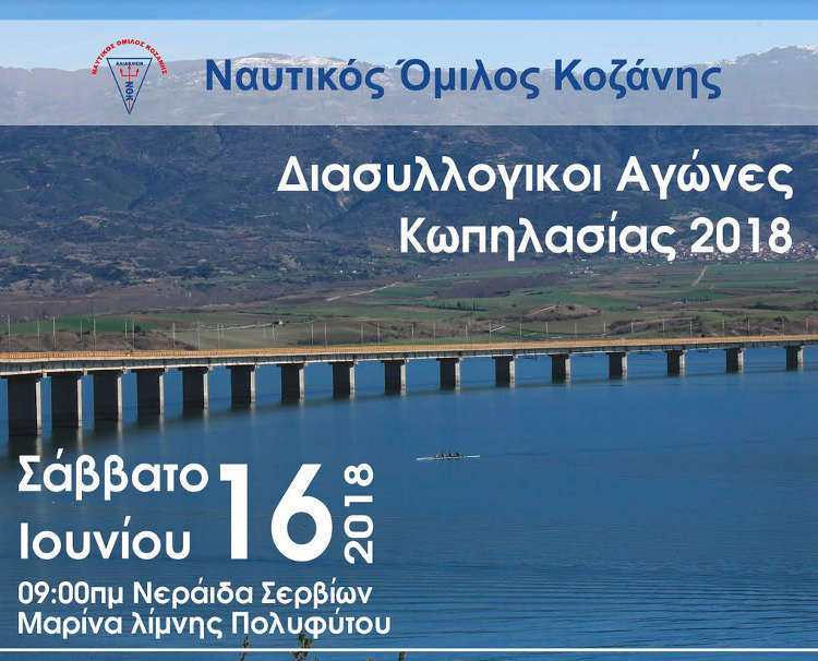 Ο Ναυτικός Όμιλος Κοζάνης σας προσκαλεί στους διασυλλογικούς αγώνες κωπηλασίας που διοργανώνει το Σάββατο 16 Ιουνίου 2018, με ώρα έναρξης αγώνων 9.00π.μ., ώρα έναρξης απονομών 12.00 και ώρα λήξης αγώνων 13.00, στον χώρο του Ναυτικού Ομίλου, στην μαρίνα της Νεράιδας, στη λίμνη Πολυφύτου.
