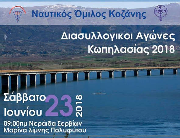 Ο Ναυτικός Όμιλος Κοζάνης σας προσκαλεί στους διασυλλογικούς αγώνες κωπηλασίας που διοργανώνει το Σάββατο 23 Ιουνίου 2018, με ώρα έναρξης αγώνων 9.00π.μ., ώρα έναρξης απονομών 13.00 και ώρα λήξης αγώνων 13.30, στον χώρο του Ναυτικού Ομίλου, στην μαρίνα της Νεράιδας, στη λίμνη Πολυφύτου.