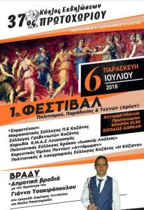 6 ΙΟΥΛΙΟΥ 2018, 9.30 μ.μ 1ο Φεστιβάλ Πολιτισμού, Παράδοσης & Τεχνών (Αρίων)