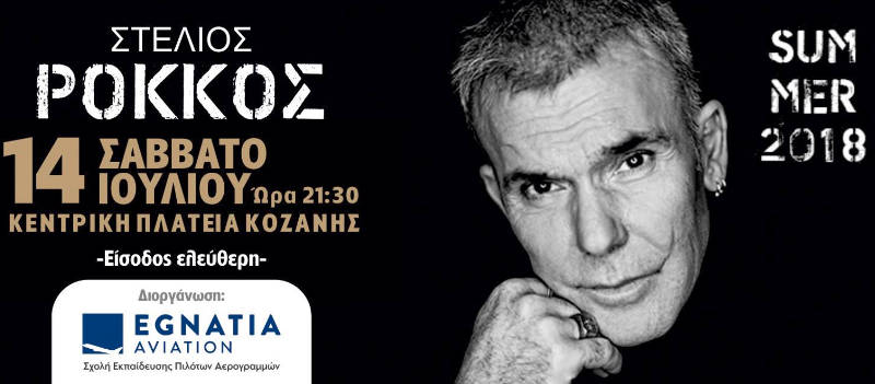 Η Σχολή Εκπαίδευσης Πιλότων Αερογραμμών Egnatia Aviation διοργανώνει συναυλία με τον Στέλιο Ρόκκο στην κεντρική πλατεία της Κοζάνης, το Σάββατο 14 Ιουλίου 2018.
