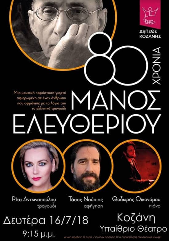 Το Δημοτικό Περιφερειακό Θέατρο Κοζάνης παρουσιάζει ένα μοναδικό αφιέρωμα στον ποιητή και συγγραφέα Μάνο Ελευθερίου, που φέτος γιορτάζει τα 80 του χρόνια.