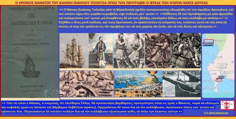 << Ο Νάννος (Ιωάννης Τσόντζας από τή Μακεδονία) σχεδόν πεντηκοντούτης εδιωρίσθη επί τού νησιδίου Δασκαλειό, επί τού οποίου είχον δύο μεγάλα πυροβόλα, είχε πολλούς μετ’ αυτού >>