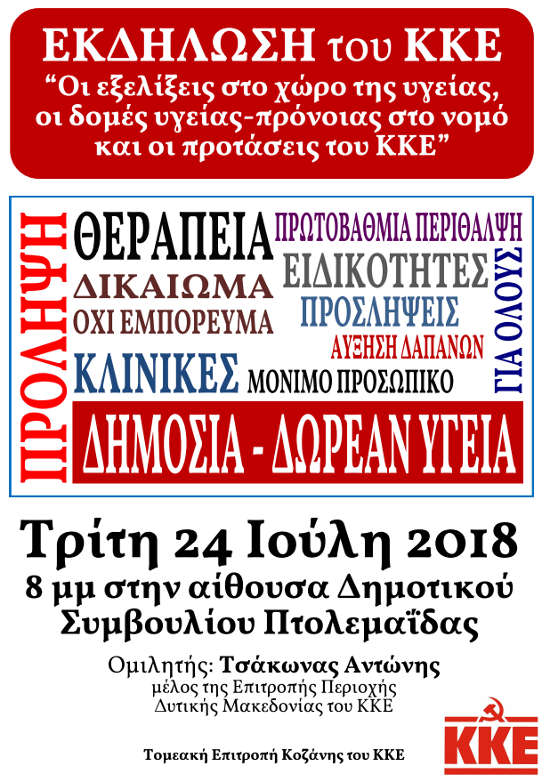 Η Τομεακή Επιτροπή Κοζάνης του ΚΚΕ θα πραγματοποιήσει εκδήλωση, την Τρίτη 24 Ιουλίου 2018 στις 20:00 στο Δημαρχείο Πτολεμαΐδας, με θέμα “Οι εξελίξεις στο χώρο της Υγείας, οι δομές Υγείας – Πρόνοιας στο νομό και οι προτάσεις του ΚΚΕ”. Κεντρικός ομιλητής Αντώνης Τσάκωνας, μέλος της Επιτροπής Περιοχής Δυτικής Μακεδονίας του ΚΚΕ.