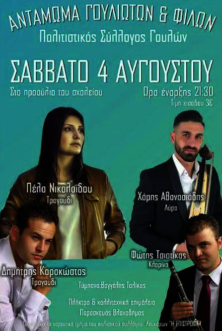 Ο Πολιτιστικός Σύλλογος Γουλών σας προσκαλεί στο Αντάμωμα Γουλιωτών και φίλων 2018 το Σάββατο 4 Αυγούστου, στο προαύλειο χώρο του Δημοτικού Σχολείου Γουλών.