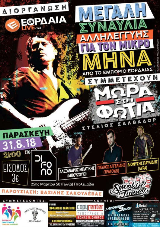 Το eordaialive.com διοργανώνει μεγάλη συναυλία αλληλεγγύης, με σκοπό την στήριξη της πολύτεκνης οικογένειας του 8χρονου Μηνά από το Εμπόριο Εορδαίας, που πάσχει από σάρκωμα κοιλίας αγνώστου ταυτότητας , έχει κάνει δεκαπέντε χημειοθεραπείες , και πρέπει να χειρουργηθεί, πιθανότατα στο εξωτερικό.