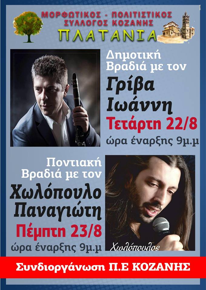 Κοζάνη 16/08/2018 22 και 23 Αυγούστου οι εκδηλώσεις του Συλλόγου Πλατάνια στην Κοζάνη 0 22 και 23 Αυγούστου οι εκδηλώσεις του Συλλόγου Πλατάνια στην Κοζάνη. Περισσότερες πληροφορίες στην παρακάτω αφίσα: