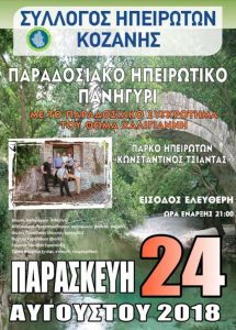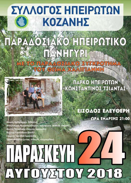 Ο Σύλλογος Ηπειρωτών Κοζάνης προσκαλεί τα μέλη και τους φίλους του καθώς και τους λάτρεις της γνήσιας δημοτικής μουσικής, στο Παραδοσιακό Πανηγύρι που διοργανώνει την Παρασκευή 24 Αυγούστου 2018 ανήμερα της εορτής του Αγίου Κοσμά του Αιτωλού στο “Πάρκο των Ηπειρωτών- Κων.Τσιάντας”