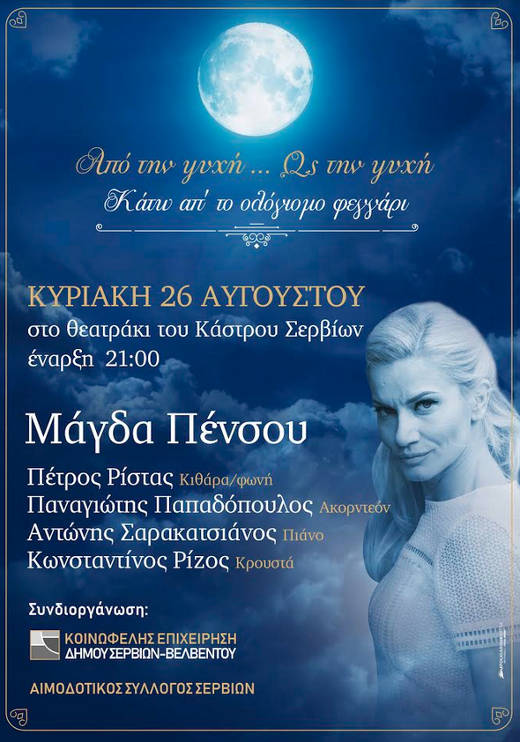 «Από την ψυχή … ως την ψυχή κάτω απ’ το ολόγιομο φεγγάρι» είναι ο χαρακτηριστικός τίτλος της συναυλίας, που συνδιοργανώνουν ο Αιμοδοτικός Σύλλογος Σερβίων «Οι Άγιοι Ανάργυροι» και η Κοινωφελής Επιχείρηση Σερβίων-Βελβεντού την προσεχή Κυριακή 26 Αυγούστου.
