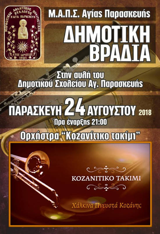 Ο Μ.Α.Π.Σ. Αγίας Παρασκευής διοργανώνει Δημοτική Βραδιά την Παρασκευή 24 Αυγούστου 2018 στον χώρο του δημοτικού σχολείου Αγίας Παρασκευής με ώρα έναρξης 9꞉00 μ.μ.