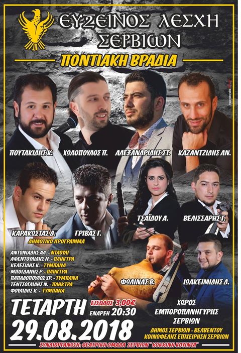 Σέρβια - Βελβεντό 23/08/2018 Ποντιακή βραδιά στις 29 Αυγούστου από την Εύξεινο Λέσχη Σερβίων 0 Ποντιακή βραδιά στις 29 Αυγούστου από την Εύξεινο Λέσχη Σερβίων. Περισσότερες πληροφορίες στην παρακάτω αφίσα: