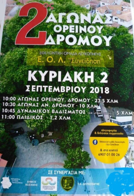 Η Εθελοντικη ομαδα Λευκοπηγης ΕΟΛ Συνειδηση, σε συνεργασια με την Περιφερεια Δυτικης Μακεδονιας,τον Δημο Κοζανης, τον ΟΑΠΝ, τον ΣΔΥ Κοζανης και την Τ.Κ Λευκοπηγης, διοργανωνει τον 2ο Αγωνα ορεινου τρεξιματος που θα περιλαμβανει 4 αγωνες.