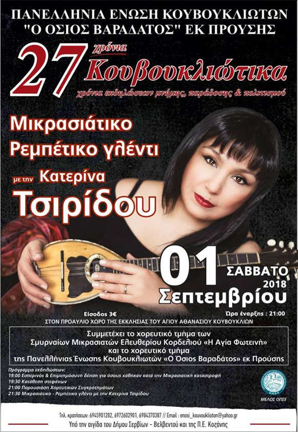 Η Πανελλήνια Ένωση Κουβουκλιωτών «Ο Όσιος Βαραδάτος» εκ Προύσης, σας προσκαλεί στα «ΚΟΥΒΟΥΚΛΙΩΤΙΚΑ 2018», το Σάββατο 1 Σεπτεμβρίου 2018 με μικρασιάτικο και ρεμπέτικο γλέντι με την Κατερίνα Τσιρίδου, στον προαύλιο χώρο της εκκλησίας του Αγίου Αθανασίου Κουβουκλίων και ώρα 21:00 μ.μ.