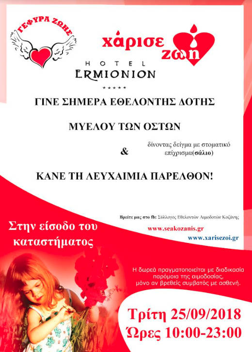 Ο Σύλλογος Εθελοντών Αιμοδοτών Κοζάνης «Γέφυρα Ζωής» σε συνεργασία με το HOTEL ERMIONIO παίρνει δείγμα στοματικού επιχρίσματος (δηλαδή σάλιου) στην Είσοδο του HOTEL(café –bar Le Roi) την Τρίτη 25 Σεπτεμβρίου 2018 από τις 10:00- 23:00.