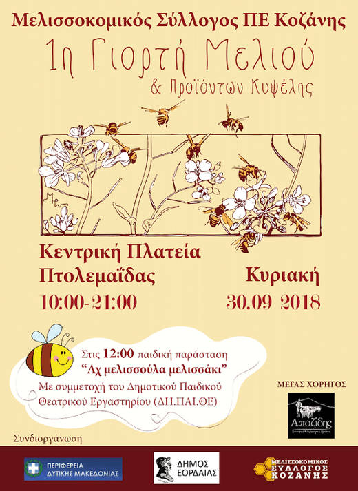 Πτολεμαΐδα 27/09/2018 Έρχεται η 1η Γιορτή Μελιού στην Πτολεμαΐδα από τον Μελισσοκομικό Σύλλογο Π.Ε. Κοζάνης 0 Έρχεται η 1η Γιορτή Μελιού στην Πτολεμαΐδα από τον Μελισσοκομικό Σύλλογο Κοζάνης. Περισσότερες πληροφορίες στην παρακάτω αφίσα: