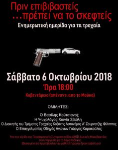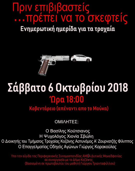 Ημερίδα με θέμα τη πρόληψη των τροχαίων ατυχημάτων και ειδικά στις νεαρές ηλικίες θα πραγματοποιηθεί το Σάββατο 6 Οκτωβρίου 2018 και ώρα 18.00 στο Κοβεντάρειο.
