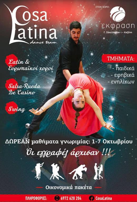 Η χορευτική σεζόν ξεκινά και οι Cosa Latina μας καλωσορίζουν με ολοκαίνουρια τμήματα παιδικά, εφηβικά και ενηλίκων και δωρεάν μαθήματα γνωριμίας με όλους τους λατινοαμερικάνικους και ευρωπαϊκούς χορούς (rumba, cha-cha, samba, paso doble, jive, salsa, bachata, merengue, disco, rock ‘n’ roll, tango, waltz, foxtrot κλπ.).