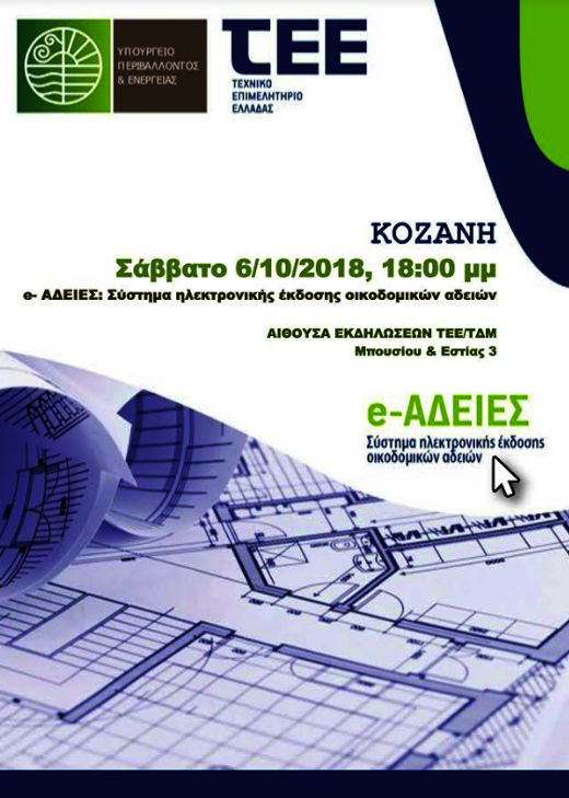 Το ΤΕΕ/Τμήμα Δυτικής Μακεδονίας σε συνεργασία με το κεντρικό ΤΕΕ, διοργανώνει ενημερωτική εκδήλωση με θέμα: “ΠΑΡΟΥΣΙΑΣΗ ΣΥΣΤΗΜΑΤΟΣ ΗΛΕΚΤΡΟΝΙΚΗΣ ΕΚΔΟΣΗΣ ΟΙΚΟΔΟΜΙΚΩΝ ΑΔΕΙΩΝ”, η οποία θα πραγματοποιηθεί το Σάββατο 6 Οκτωβρίου 2018 και ώρα 18.00 στην αίθουσα εκδηλώσεων του ΤΕΕ/ΤΔΜ (Μπουσίου & Εστίας 3, Κοζάνη).