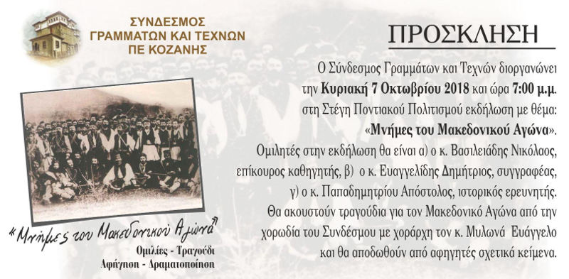 Κοζάνη 01/10/2018 Εκδήλωση του Συνδέσμου Γραμμάτων και Τεχνών Π.Ε. Κοζάνης με θέμα: «Μνήμες του Μακεδονικού Αγώνα» 1 Εκδήλωση του Συνδέσμου Γραμμάτων και Τεχνών Π.Ε. Κοζάνης με θέμα: «Μνήμες του Μακεδονικού Αγώνα»