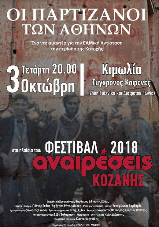 Το φεστιβάλ ΑΝΑΙΡΕΣΕΙΣ σήμερα Τετάρτη 3/10 ανοίγει τις πύλες του με την προβολή του ντοκιμαντέρ για την ΕΑΜική Αντίσταση «Οι Παρτιζάνοι των Αθηνών» σε σκηνοθεσία του Ξενοφώντα Βαρδαρού και Γιάννη Ξύδα στις 20.00 στην “Κιμωλία – Συγχρονος Καφενές”