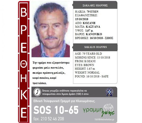 Συγκεκριμένα, ο 79χρονος χάθηκε το πρωί της 15/10/2018, από το σπίτι του στην Κοζάνη, όταν βγήκε για την καθημερινή του βόλτα και δεν κατάφερε να επιστρέψει.