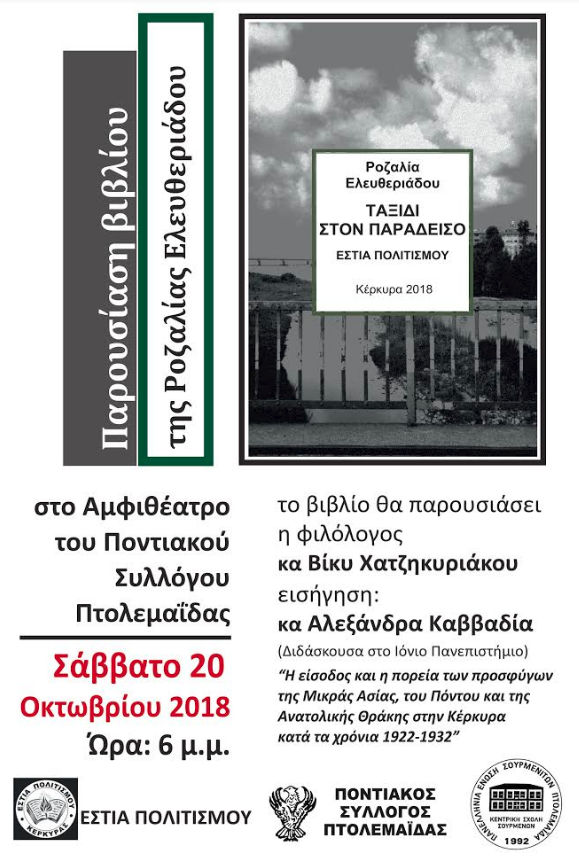 Πτολεμαΐδα 17/10/2018 Πτολεμαΐδα: Παρουσίαση του βιβλίου της Ροζαλίας Ελευθεριάδου «Ταξίδι στον Παράδεισο» 0 Πτολεμαΐδα: Παρουσίαση του βιβλίου της Ροζαλίας Ελευθεριάδου «Ταξίδι στον Παράδεισο». Περισσότερες πληροφορίες στην παρακάτω αφίσα: